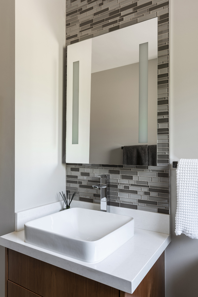Sunny Powder Bath:It was imperative to create a bright, open feel in this small yet important space. The crisp, pale wall color and white countertop achieves an airy feel, while the drama of the vertical backsplash tile creates the feel of a high ceiling. Chrome fixtures reflect natural sunlight, and the lit mirror saves valuable wall space by eliminating the need for sconce lights.