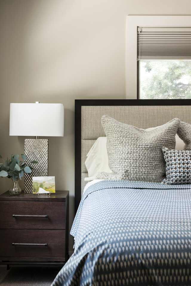The palette of the master bedroom is noticeably a step darker and richer than other areas of the home, creating a cozy, calming environment for the homeowners. Deep blue and mahogany tones evoke a cool mountain evening approaching, while the metallic bedside lamps and decorative wool pillows exhibit texture akin to pinecones and tree bark. Textile patterns are small-scale, rounded, and organic, eliciting the feel of newly formed dewdrops on a forest floor.