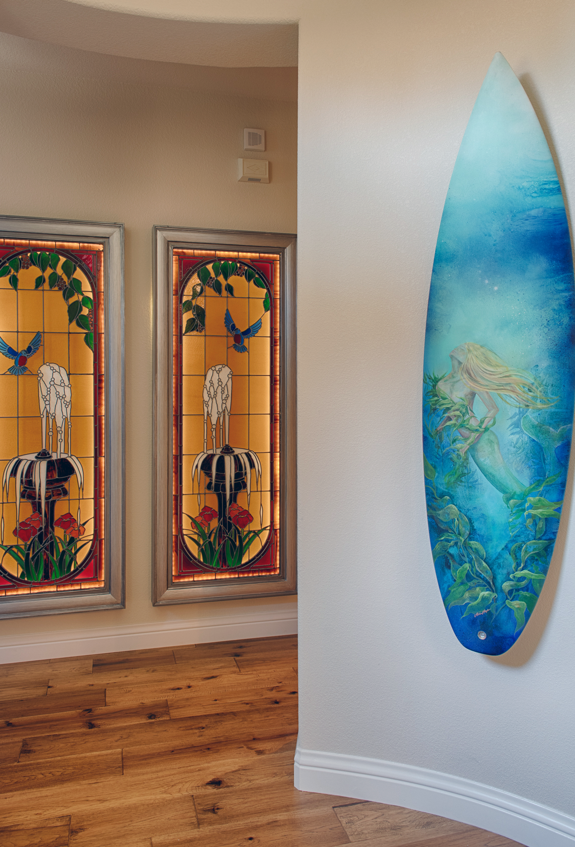 Like many of the items throughout Julie's home, the mermaid artwork in the entryway tells a story. Julie purchased the board, originally owned by pro-surfer Bianca Buitendag, at charity auction benefiting Aleph Surf International. The non-profit organization - one of several Bianca supports - gives disadvantaged youth and their families the opportunity to experience the impossible through the recreational sport of surfing, the arts, education, and empowerment through employment. Once home, Julie enlisted talented painter Maia Negre to transform the surfboard into a one-of-a-kind work of art.